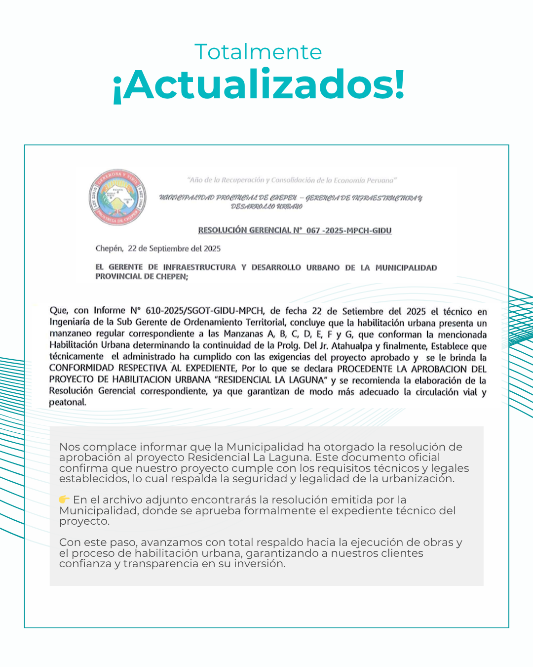 Que la municipalidad ha revisado y validado todo el plan urbano: las vías de acceso, redes de agua y desagüe, energía eléctrica, áreas verdes y el trazado completo del conjunto residencial. En otras palabras, Residencial La Laguna cumple con todos los requisitos técnicos y legales para su desarrollo urbano, garantizando seguridad y respaldo a cada comprador.
